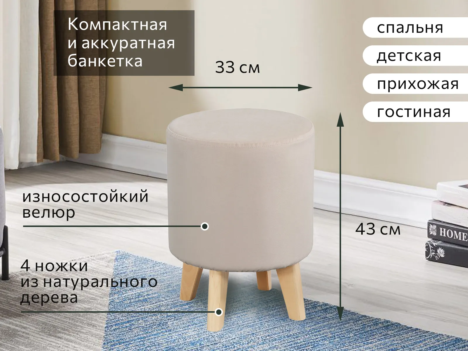 <virtues>Покупала в нестандартной ткани: белый барашек. Банкетка очень милая и функциональная, пользуюсь каждый день. Крепкое основание, легкая, ножки из натурального дерева. Даже встаю на нее, если нужно что-то сверху достать, выдерживает :) Покупкой очень довольна.</virtues> <limitations>нет</limitations>