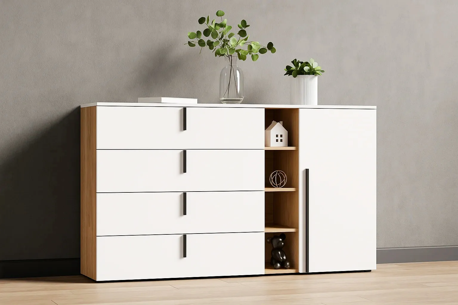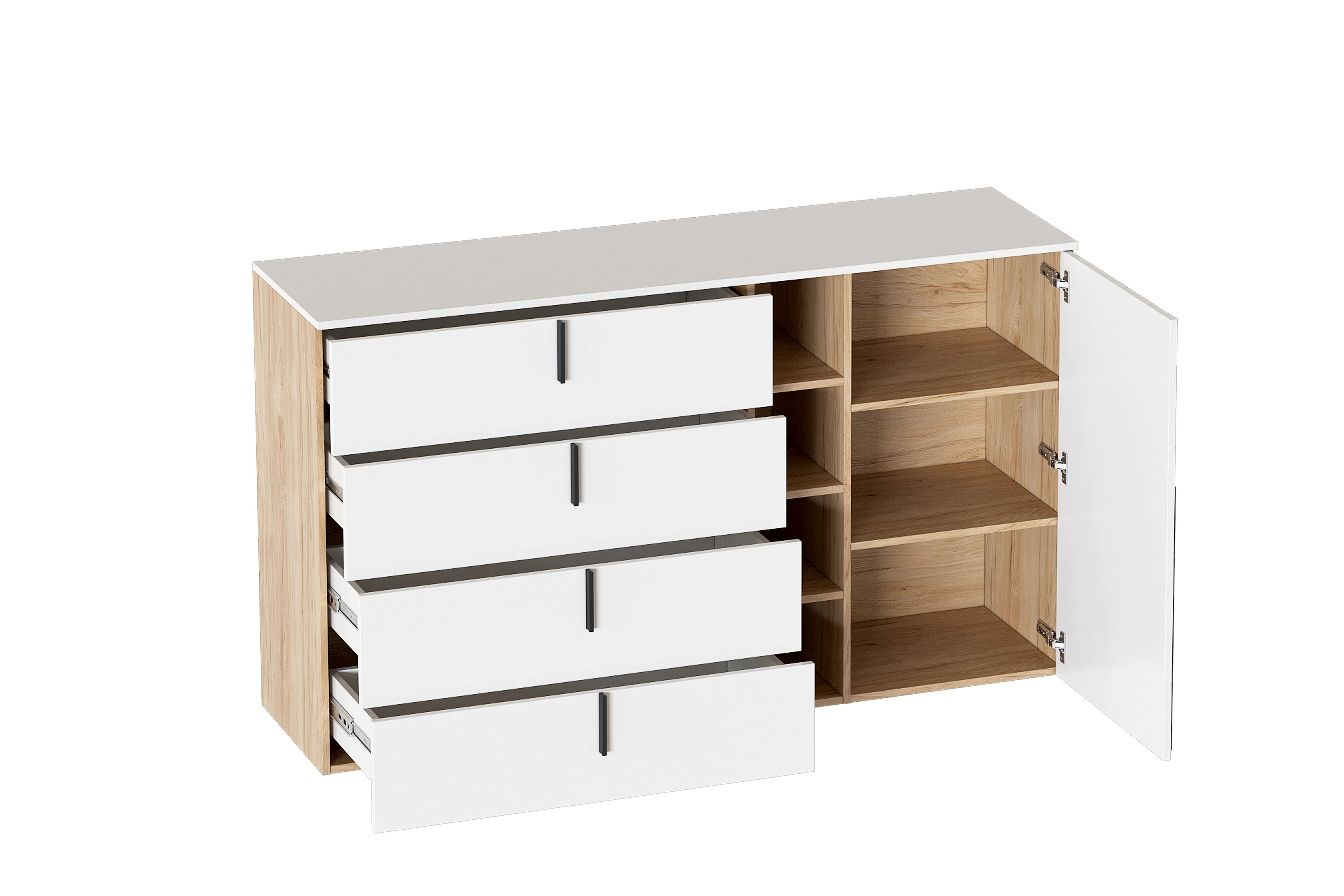 Цветовое исполнение корпуса: Дуб светлый натуральный, фасад: Белая Аляска WML.